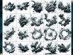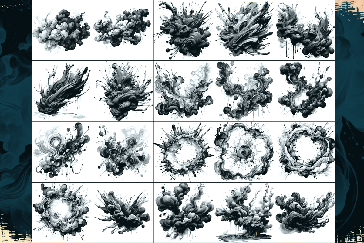This is a collection of 20 abstract ink cloudy splatters. These 20 Inky Kloud Brushes Vol.2 splatters vary in shape and size, from swirling clouds to sharp, explosive bursts. They create a sense of movement and energy, seemingly frozen in time. Some splatters have a circular shape with a central void, while others form intricate, flowing patterns. The image evokes a sense of power and fluidity, capturing the chaotic beauty of ink as it explodes across a surface. A diverse and expressive ink splatters that could be used for various creative purposes. Find the Vol.1 here!