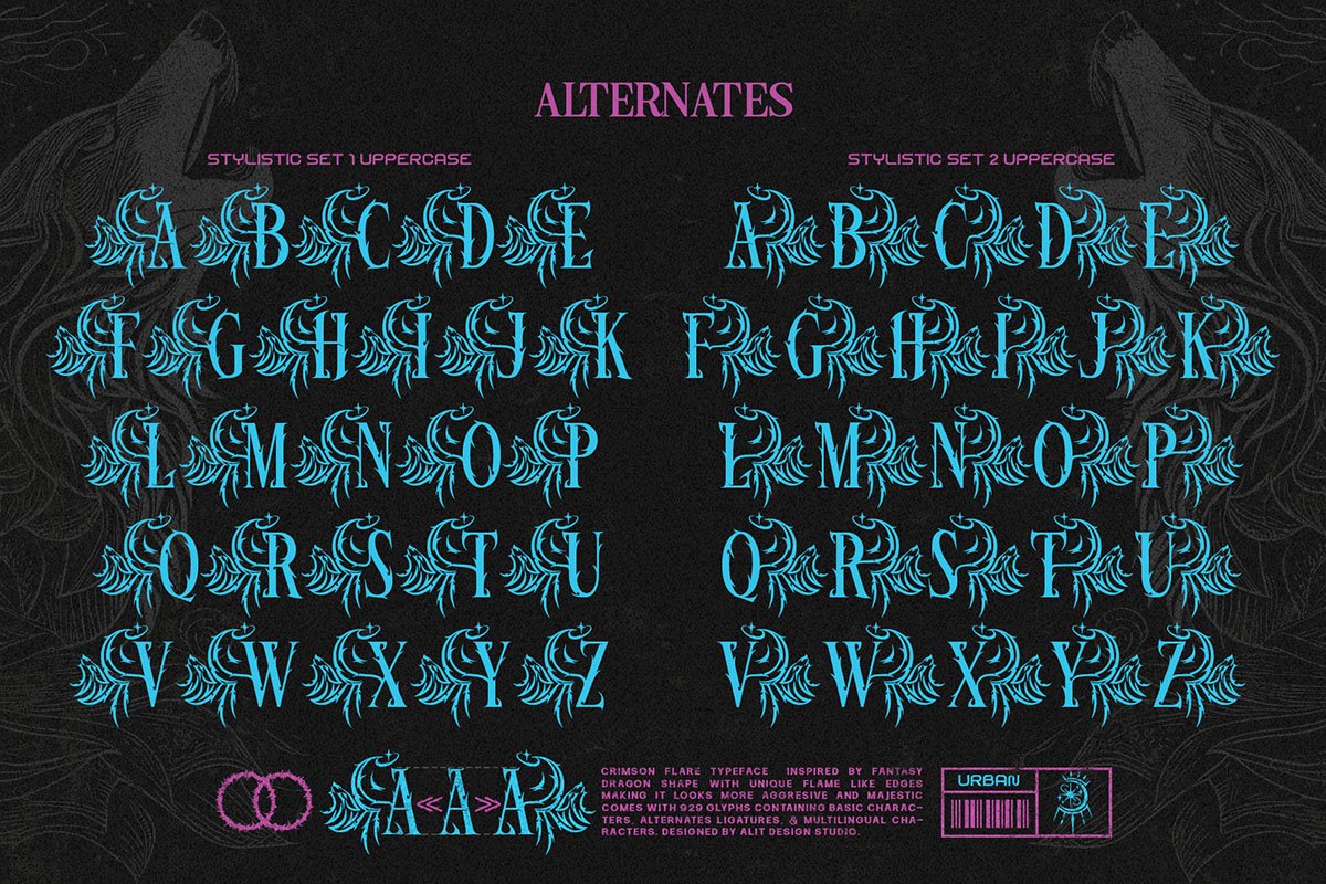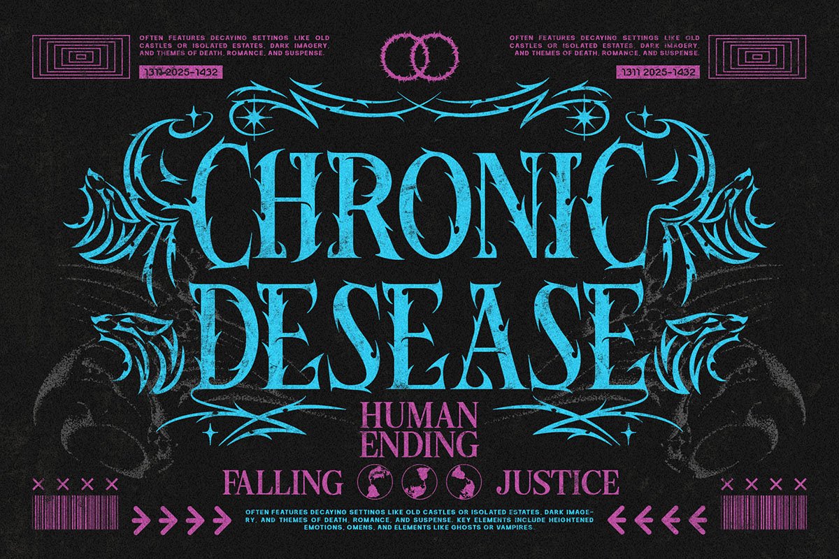 Inspired by the fantastical silhouettes of dragon scales and the feral sharpness of wolf fangs, it is not merely a font—it is a visual weapon. This “Neo-Gothic” Blackletter style features unique, flame-like edges and razor-sharp terminals that command attention immediately. It captures the essence of mystery, rebellion, and raw power.