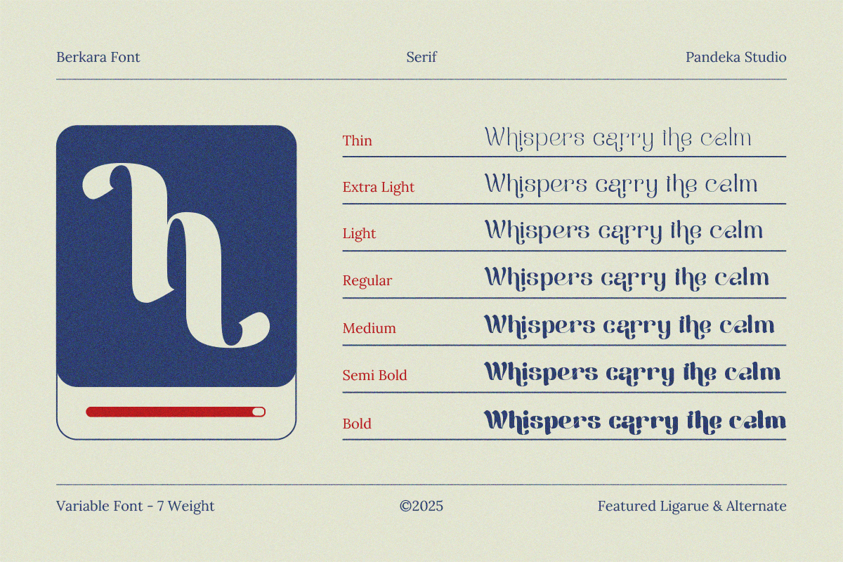 Berkara – Display Font is a vintage-inspired serif font family with a modern and elegant twist. With 7 versatile styles —Thin, Extra Light, Light, Regular, Medium, Semi Bold, and Bold— Berkara offers flexibility for a wide range of creative applications. Its refined ligatures and graceful curves make it perfect for stylish typography in luxury branding, fashion logos, editorial layouts, premium packaging, and sophisticated display design.