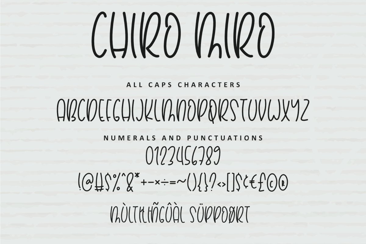 Chiro Miro Display Font is a playful marker font. It comes with unique lower and uppercase plus numbers, punctuation & multilingual letters. This font is perfect for stellar quotes, handwritten notes, sweet greeting cards, and of course stand-out branding.