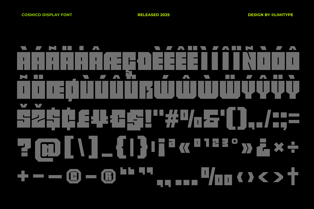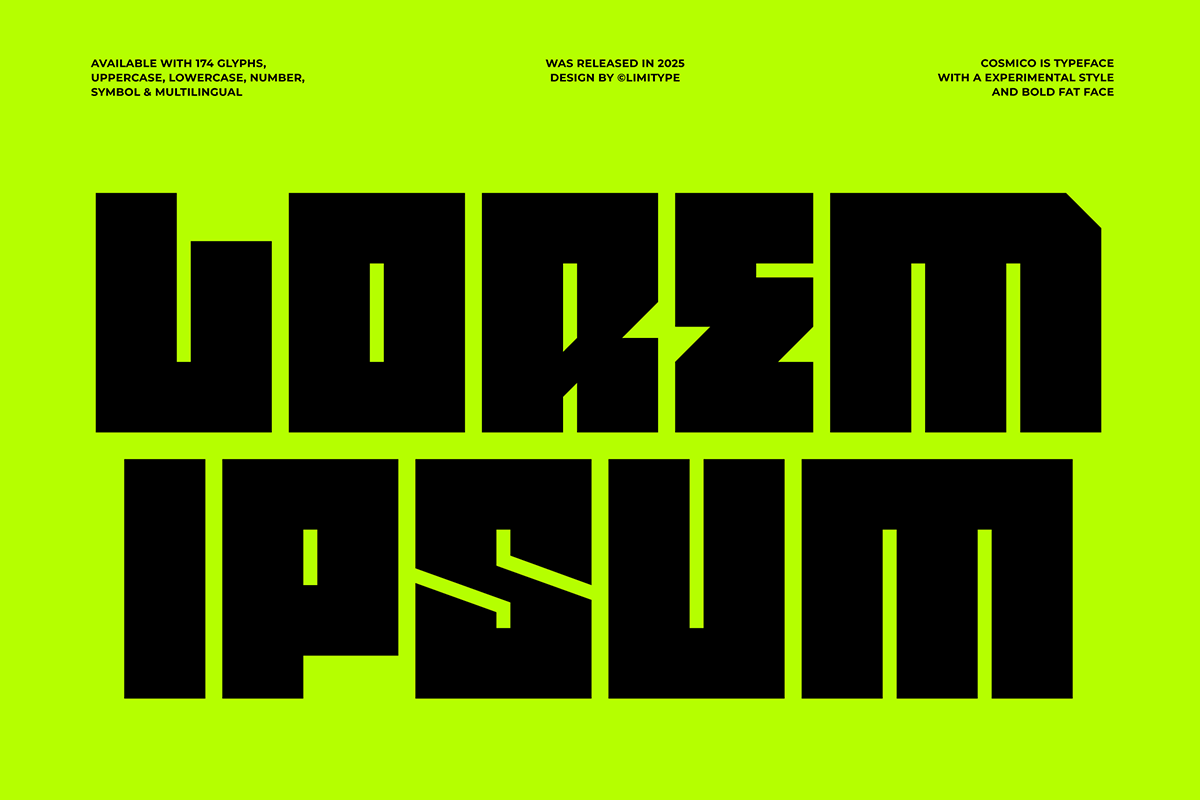 Thanks to Limitype for sharing with us this exquisite font! However, this Cosmico – Bold Font is only a demo version available for personal use. So, if you want to access more its full features and license, go get the premium version as well!