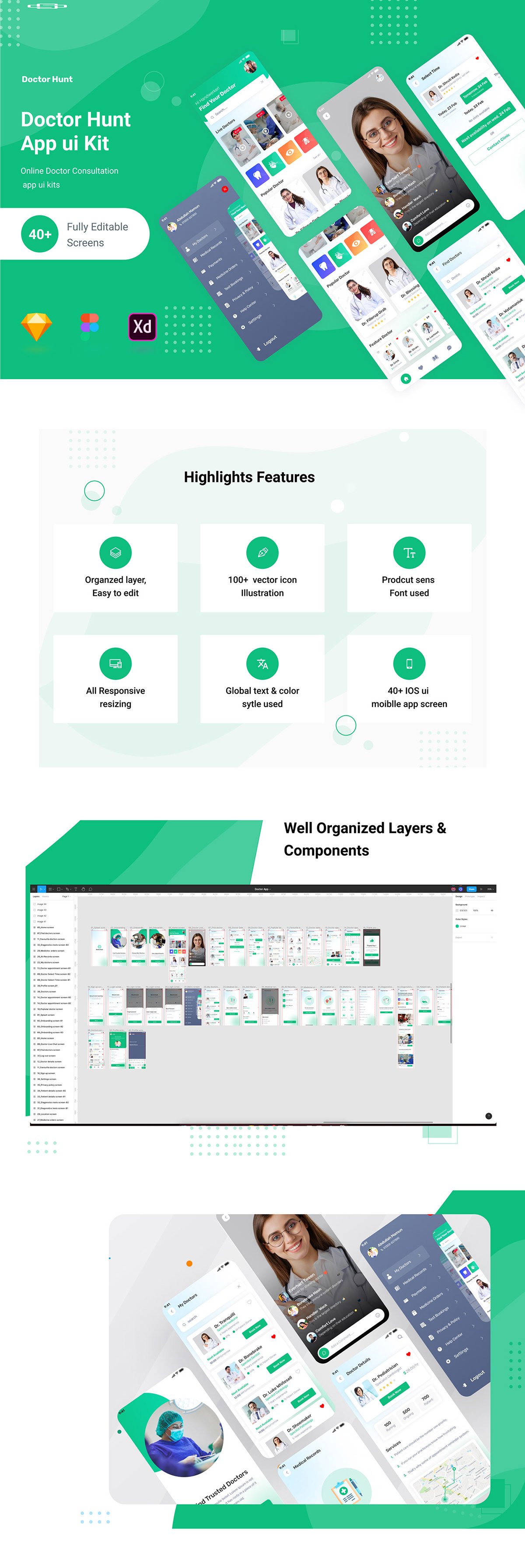 Doctor Consultant Mobile App is a UI Kit template available in Sketch, Figma, and Adobe XD. It’s here to help you build a medical application. These are great for you who is looking for inspiration and starter for your medical app project. All the files are fully editable so you can unleash your creativity on it as well.