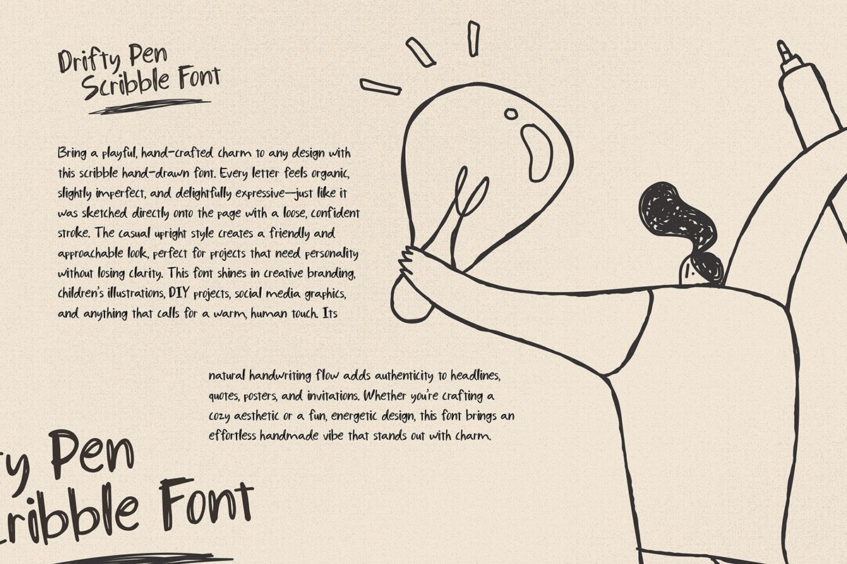 Drifty Pen – Scribble Handdrawn Font is a playful scribble hand-drawn font that brings the charm of messy doodles straight into your designs. With its loose strokes, uneven curves, and handwritten spontaneity, this font captures the feeling of writing freely with a marker on paper. Perfect for creative projects like kids’ illustrations, branding, notes, quotes, social posts, and casual graphic elements. Drifty Pen adds authenticity, warmth, and a fun handmade touch wherever it appears.