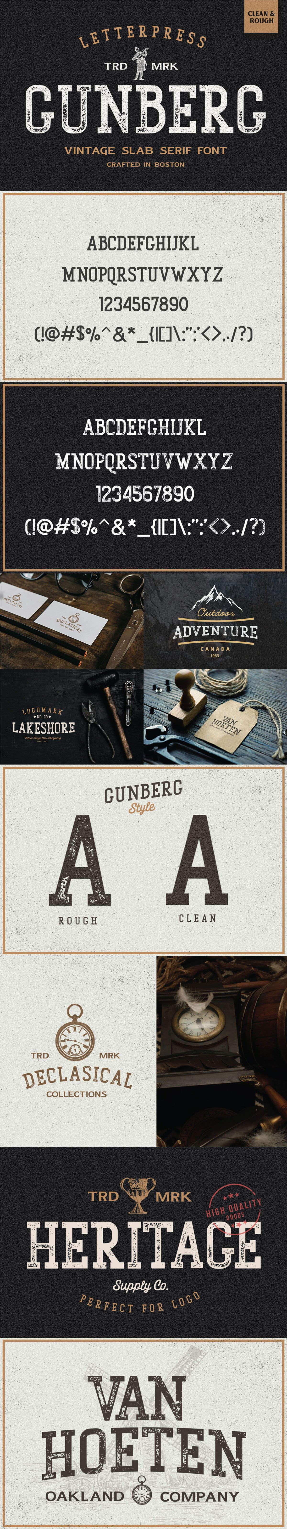 Free Gunberg Slab Serif is a vintage slab serif font with 2 styles; clean and rough. All characters have an imperfect shape that gives a natural look in design. They easily cooperates together and are perfect for creating the traditional style logos, labels, package design, lettering for t-shirts and much more. Gunberg includes western european characters (multilingual support).