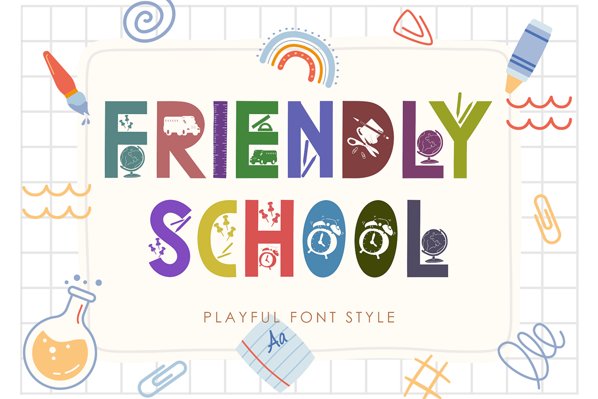 Friendly School Display Font is a unique decorative font. This font is equipped with uppercase, lowercase, numerals, punctuations and multilingual support. Very suitable for back to school, teacher’s day, Christmas, fall, autumn, Halloween, posters, prints, branding, banners, logos, stickers and others.