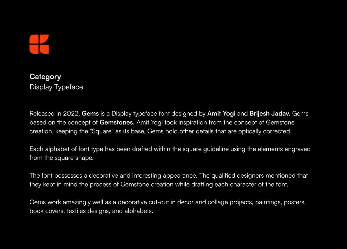 Each alphabet of font type has been drafted within the square guideline using the elements engraved from the square shape. The font possesses a decorative and interesting appearance. The qualified designers mentioned that they kept in mind the process of Gemstone creation while drafting each character of the font.