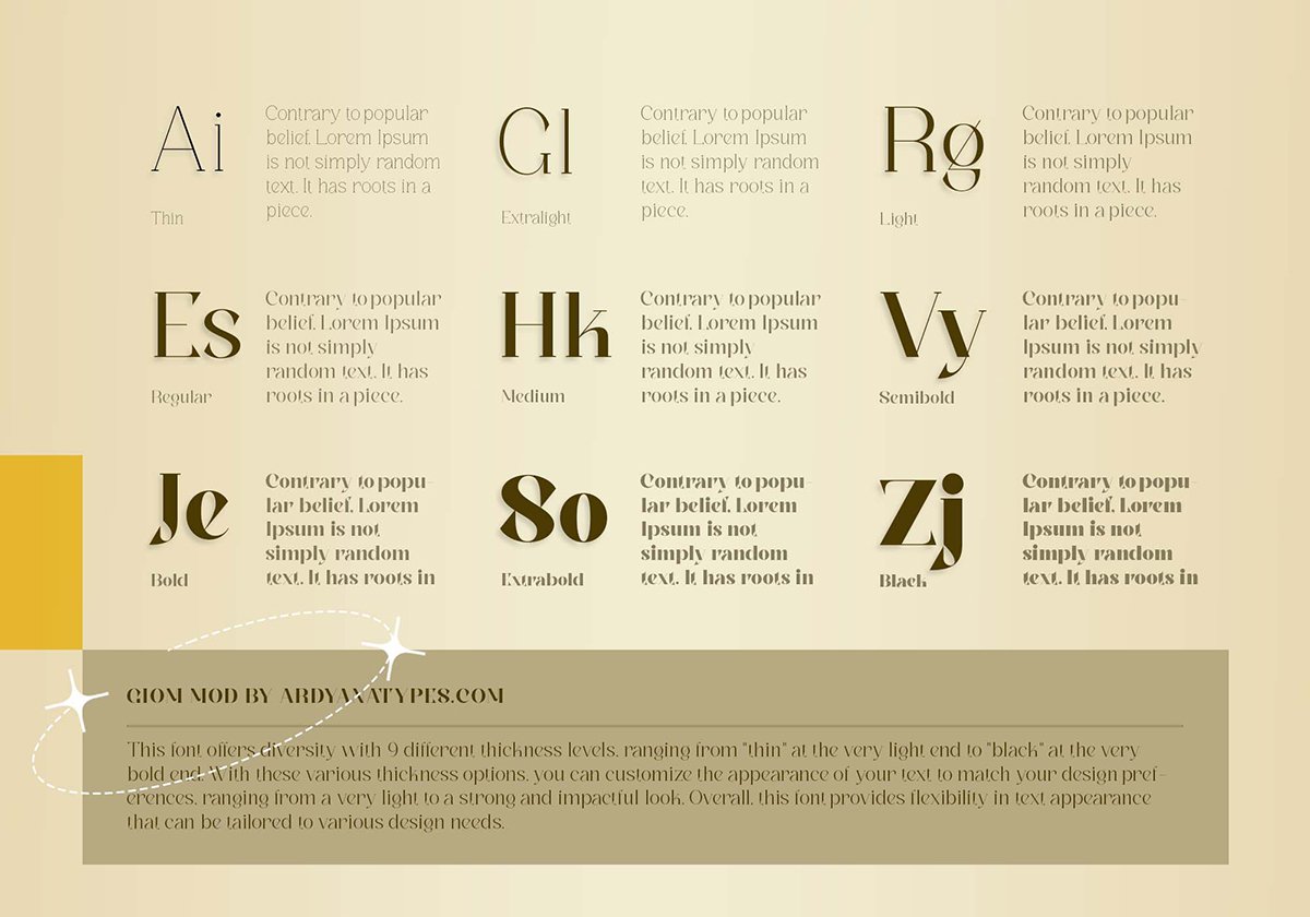 Giom Mod – Display Font is a unique and elegant display font with a distinctive serif style. This font offers nine different thickness options, ranging from Thin to Black. It provides a wide range of choices for various applications. Each thickness of Giom Mod has its own unique characteristics, allowing you to select the one that best suits your design aesthetics. For example, Thin may be suitable for light and elegant designs, while Black can be used for more dramatic and bold appearances.