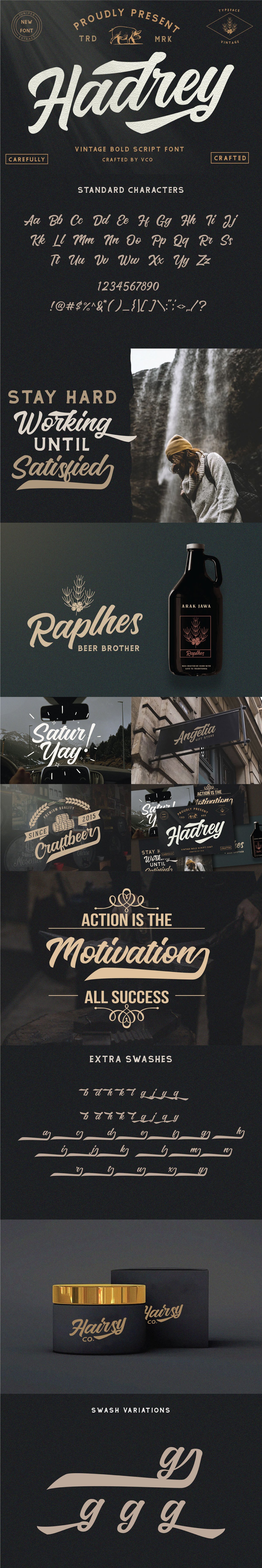 Hadrey Vintage Bold Script is a font that take inspiration from modern vintage and retro style. All characters have an imperfect shape that gives a natural look in design. This font is perfect for creating the traditional style logos, labels, package design, lettering for t-shirts and much more.