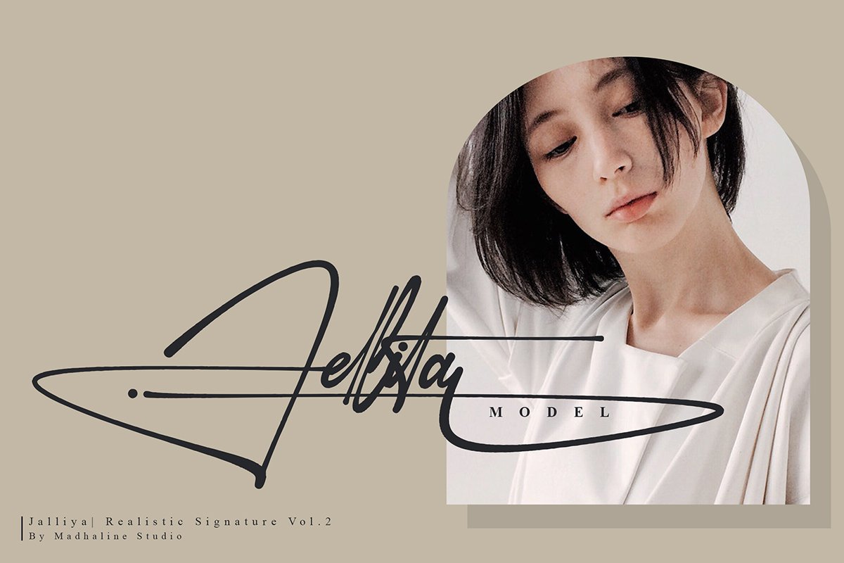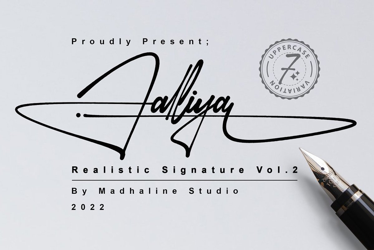 Jalliya 7 Realistic Signature Vol.2 is a realistic signature font Vol. 2 that has its own uniqueness and characteristics from a signature font, because it is handwritten manually, so it has the impression of a true signature. This font is carefully crafted with a modern touch. This font looks elegant, luxurious, natural with a beautiful signature touch.
