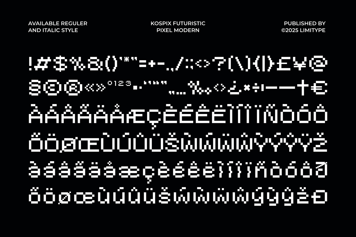 Thanks to Limitype for sharing with us this exquisite font! However, this Kospix – Pixel Font is only a demo version available for personal use. So, if you want to access more its full features and license, go get the premium version as well!