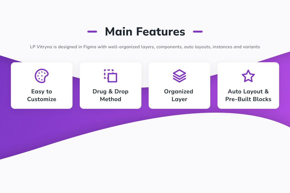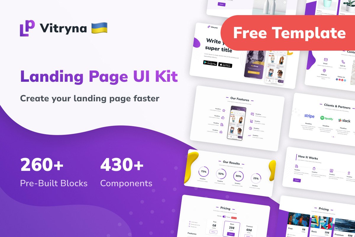 LP Vitryna – Landing Page UI Kit! Create your landing page faster using more than 260 pre-built blocks from 20 Categories! LP Vitryna is designed in Figma with well-organized layers, components, auto layouts, instances and variants. This will help you easily swap instances and modify them for your needs.
