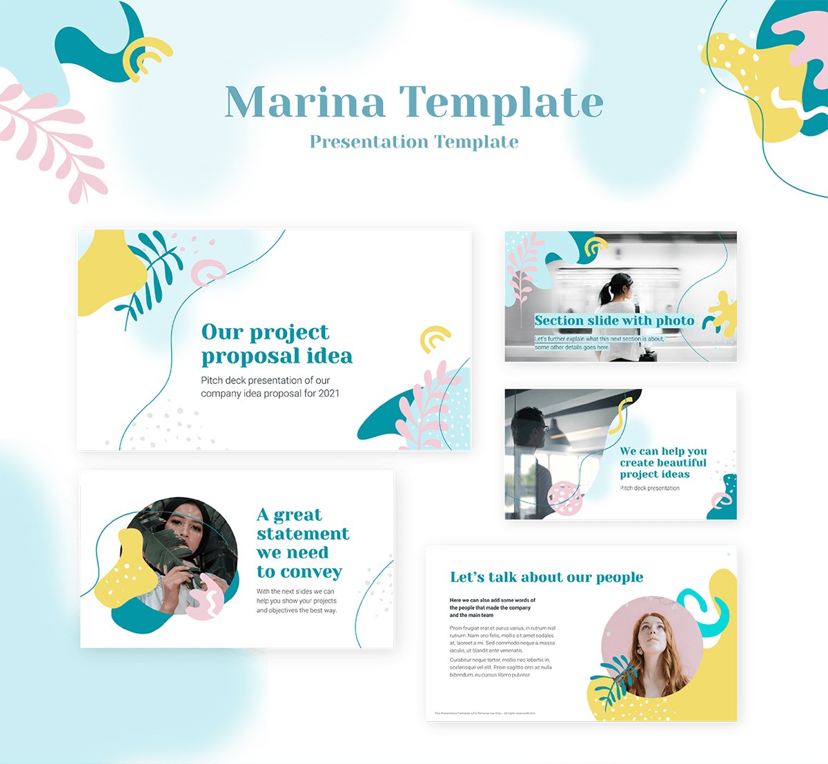 Marina Presentation Template has a modern fun style with fun colors and dynamic layouts, with a young and fresh style, all the abstract shapes were created exclusively for this deck. It is a perfect deck for start-up companies, unique pitch decks, or any creative and lively presentation. It includes several layouts that will help you communicate your ideas with a strong design.