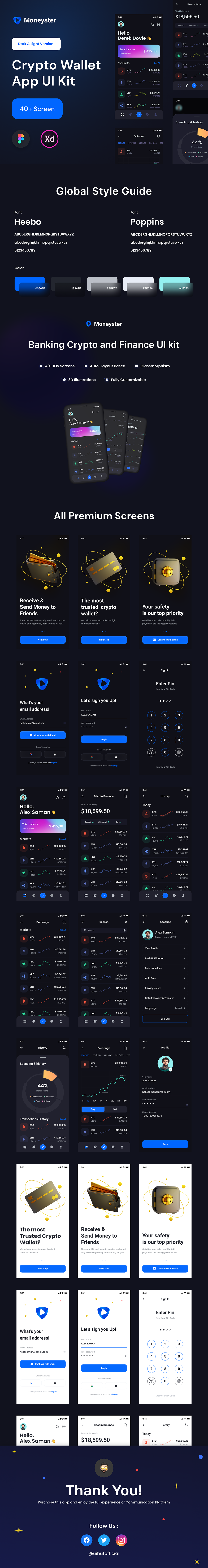 Introducing our new app called Moneyester Wallet App UI Kit, you will get 40+ app screens with Dark UI. It’s fully customizable, easy to change colors. Cryptocurrency is the new buzzword in the world of finance. Not many people are aware of how it works, or why it is gaining popularity. UI kits are often organized into different pages and sections to make it easy for designers to find the components they need. This app helps you get started by offering a comprehensive directory of cryptocurrencies. It also provides information on their future value, current market price, and past performance.