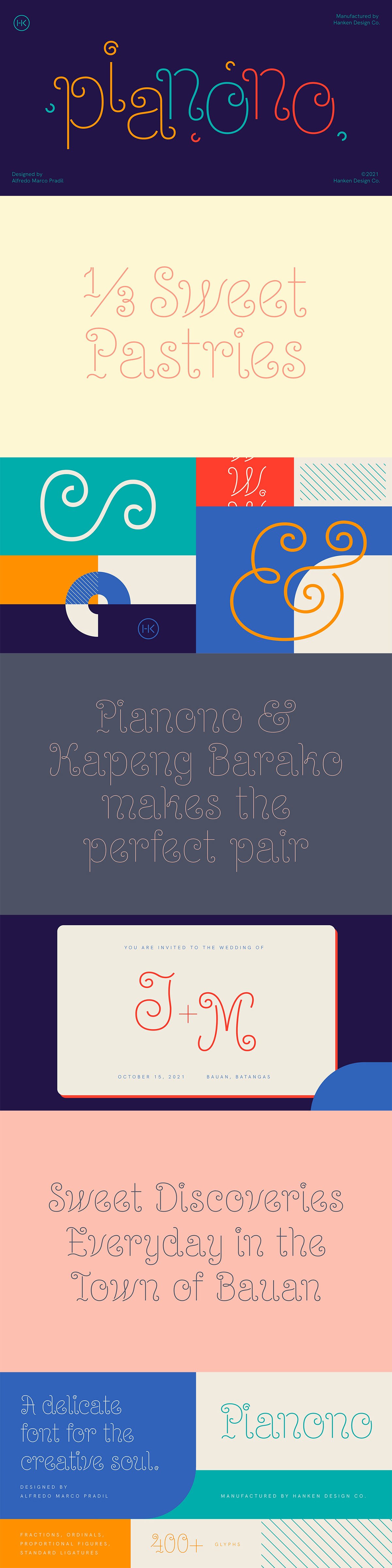 Pianono Display Typeface is a playfully simple typeface that everyone can enjoy. As relaxing as that first munch of your favorite pillowy cake, your first time writing with this one will give you a fluffy feeling rooted in satisfaction. Aside from its aesthetic appeal, a touch of history lies in each twist and turn.