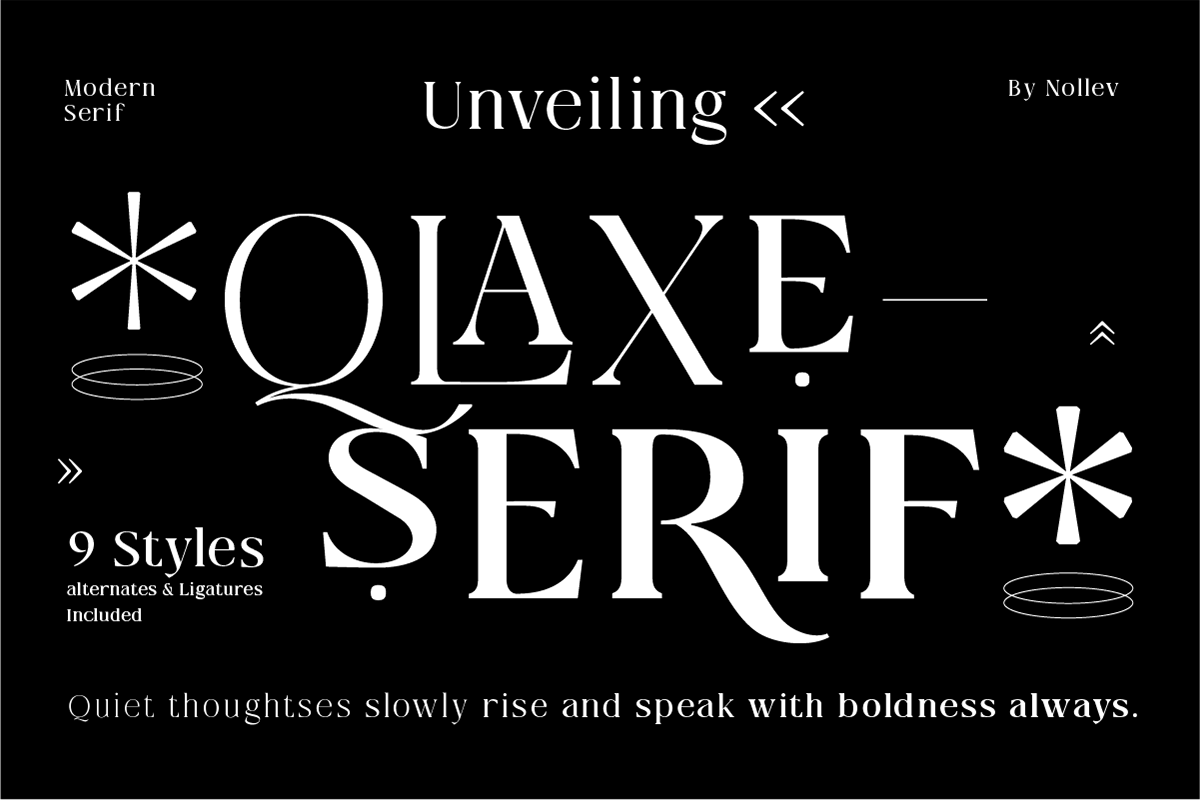 Qlaxe – Modern Serif Font is the part of a font family with a clean, confident presence and a hint of luxury. With distinctive ligatures and 9 refined styles, Qlaxe offers flexibility for everything from branding and logos to editorial layouts and packaging. Its sharp details and stylish curves give your design a polished yet expressive voice.
