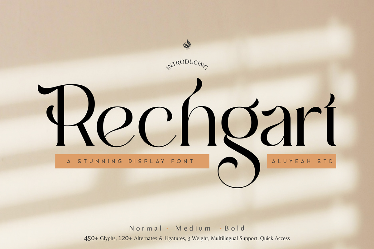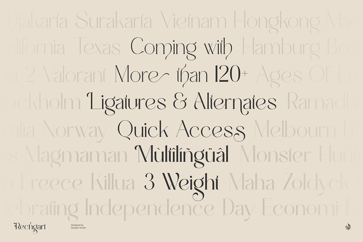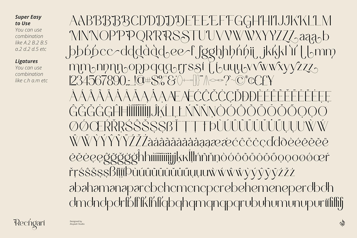 Thanks to Aluyeah Studio for sharing with us this exquisite font! However, this Rechgart – Display Font is only a demo version available for personal use. So, if you want to access more its full features and license, go get the premium version as well!
