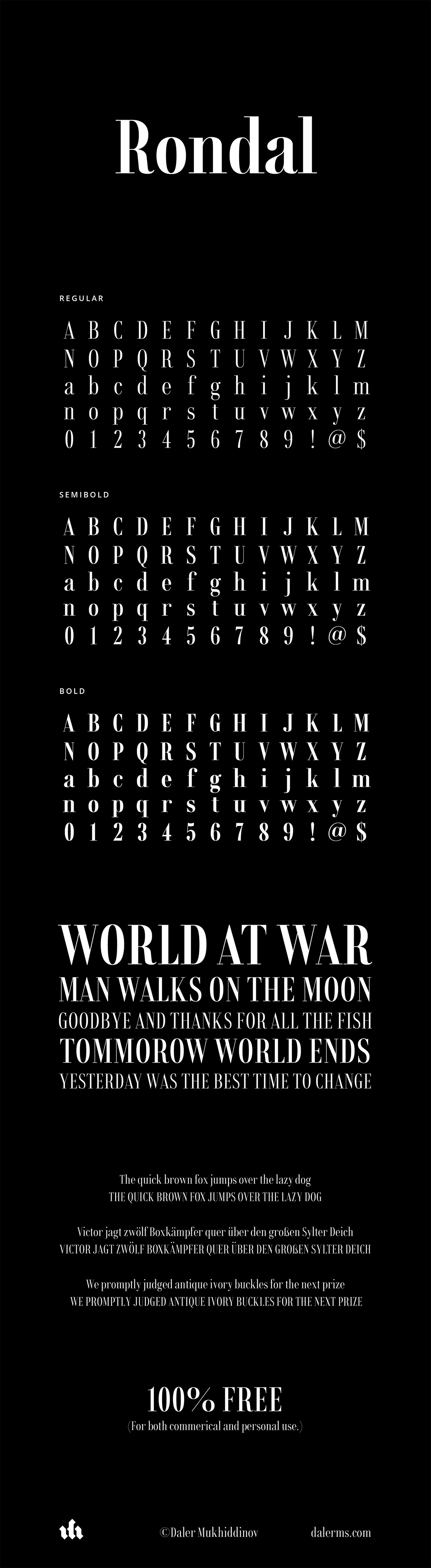 Thanks to Daler Mukhiddinov for creating and sharing this awesome typeface today! So, if you like Rondal Serif Free Typeface, make sure to visit their portfolio! Then, you can leave comments and appreciate to let them know how you think about their works. Simply click on the check out more button below to get to them.