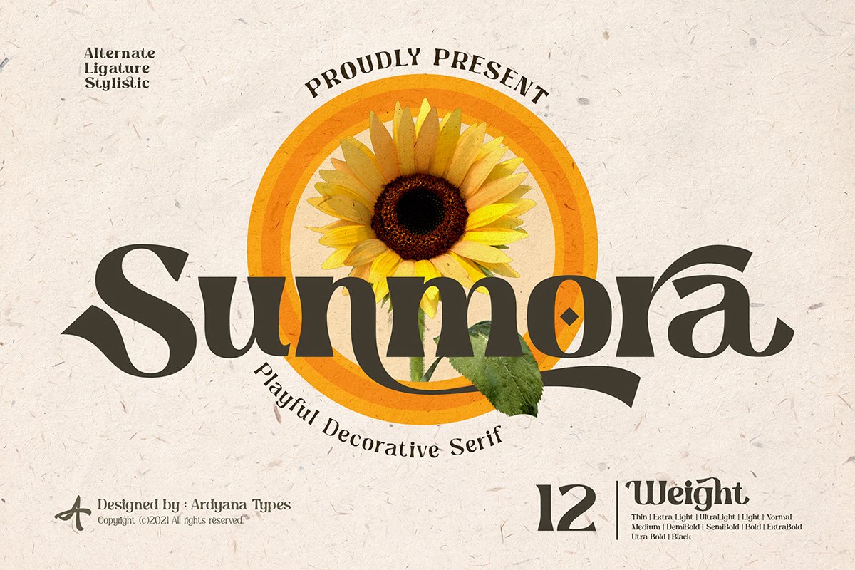 Sunmora – Playful Decorative Serif is here! The font comes with its elaborate curve and unique tail shape. Also, it is available in 12 special weight, thin to black. Make you freely set any design for headings, logos, fashion, website, floral, tagging, magazine cover, posters, and many more