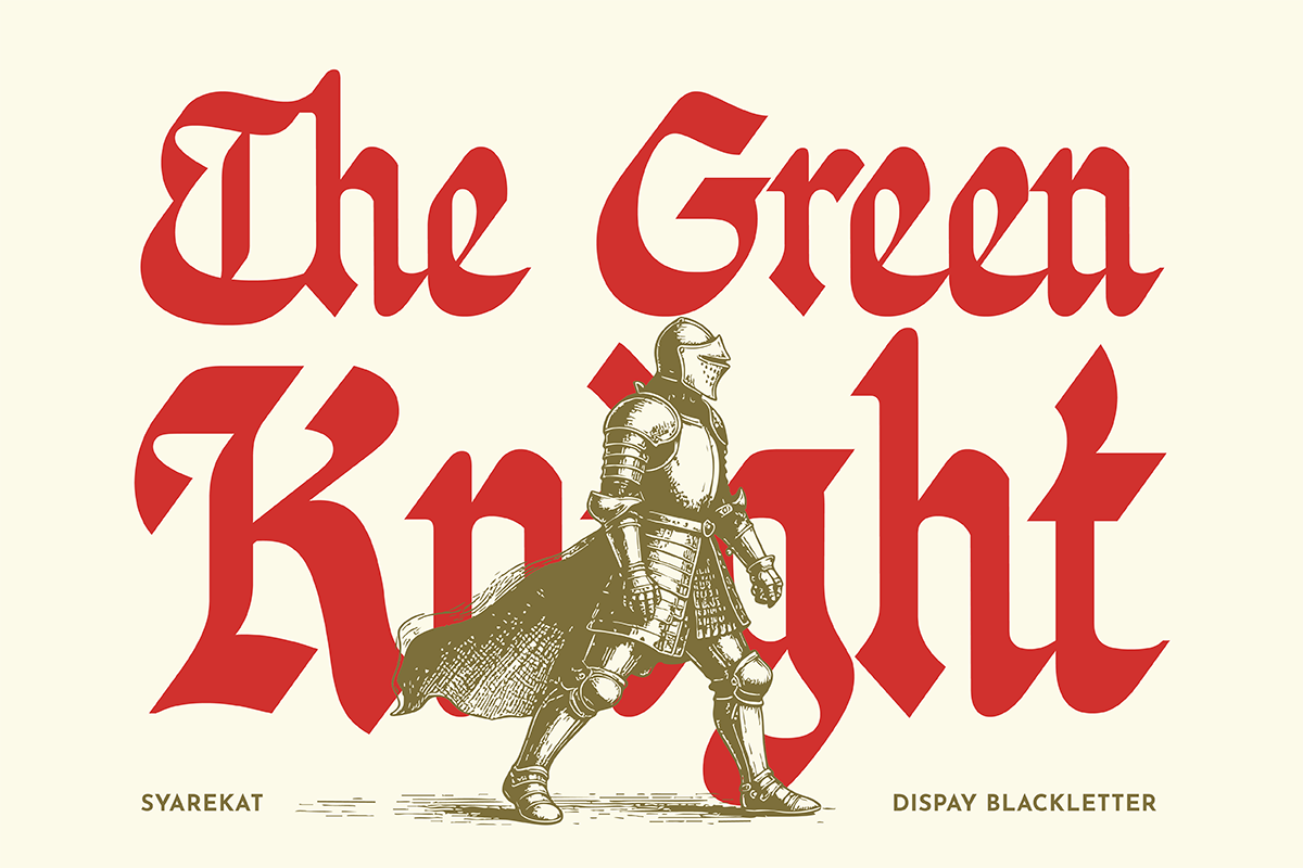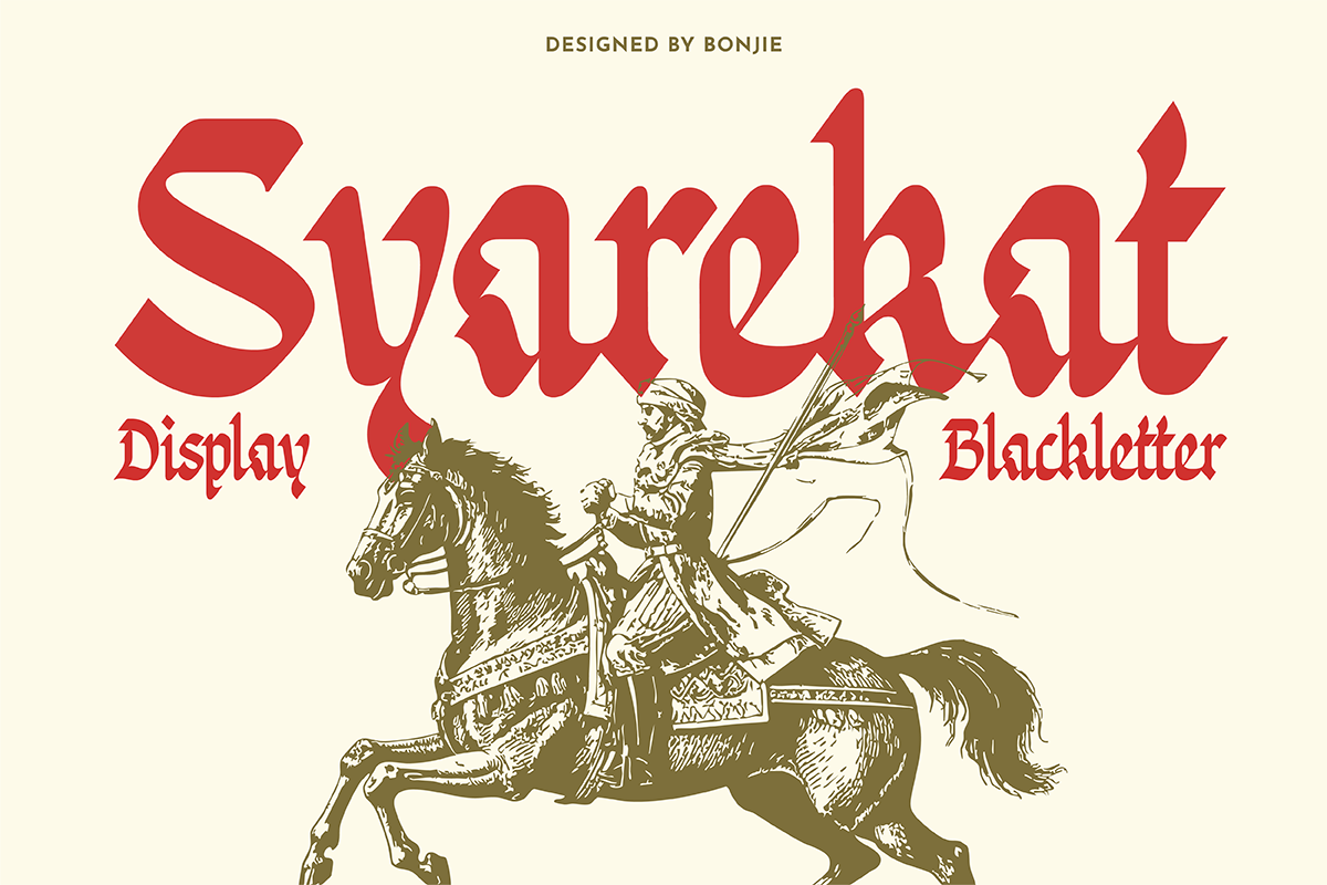 Syarekat Blackletter Font is a bold modern blackletter font. Designed with a unique blend of old English and Arabian drawing technique. This font is perfect for logotype, headings, product packaging, album covers, book covers, printed quotes, apparel design and display usage.