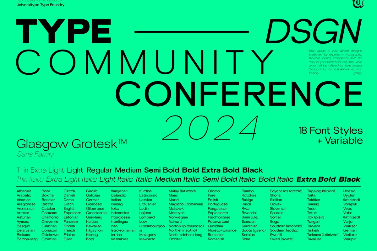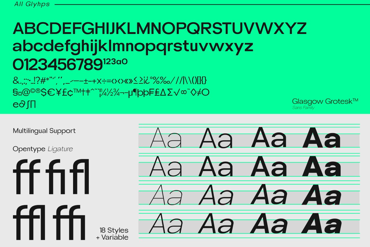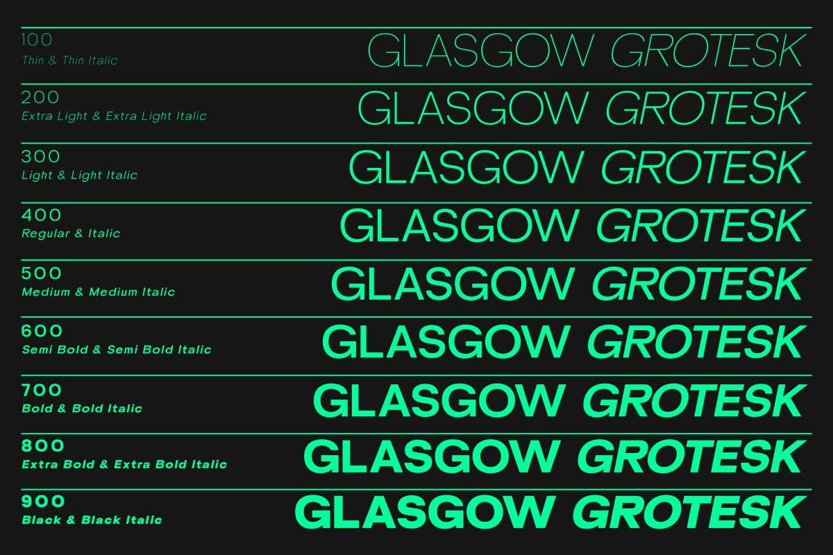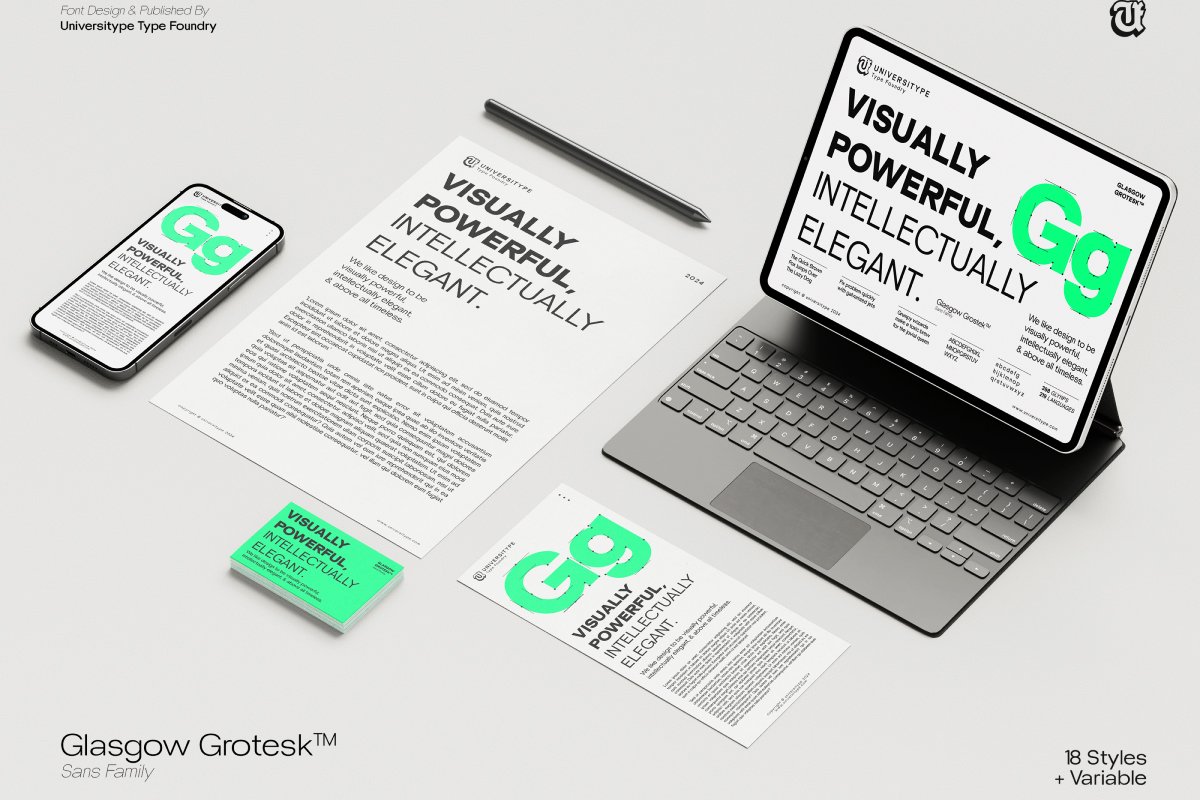 UT Glasgow Grotesk is a versatile and sophisticated sans-serif typeface, designed by the Universitype Team, that offers a full spectrum of typographic expression. As a variable font with 18 distinct styles, from thin to Black, it provides you with the ultimate flexibility to customize weight and width, making it perfect for both digital and print applications.
