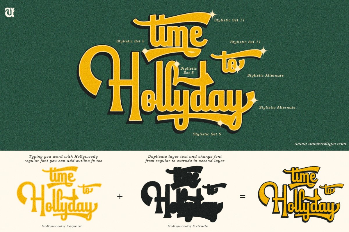 Thanks to Universitype Foundry for sharing with us this exquisite font! However, UT Hollywoody – Bold Script demo is only available for personal use. So, if you want to access more its full features and license, go get the premium version as well!